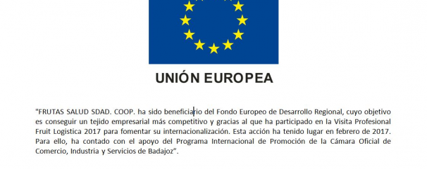 "FRUTAS SALUD SDAD. COOP. ha sido beneficiario del Fondo Europeo de Desarrollo Regional, cuyo objetivo es conseguir un tejido empresarial más competitivo y gracias al que ha participado en la Visita Profesional Fruit Logistica 2017 para fomentar su internacionalización. Esta acción ha tenido lugar en febrero de 2017. Para ello, ha contado con el apoyo del Programa Internacional de Promoción de la Cámara Oficial de Comercio, Industria y Servicios de Badajoz”.